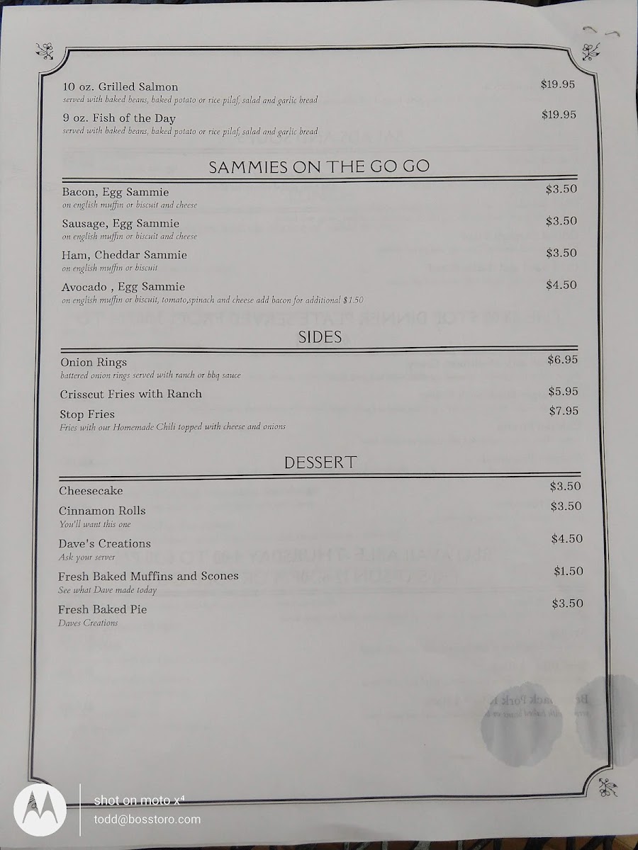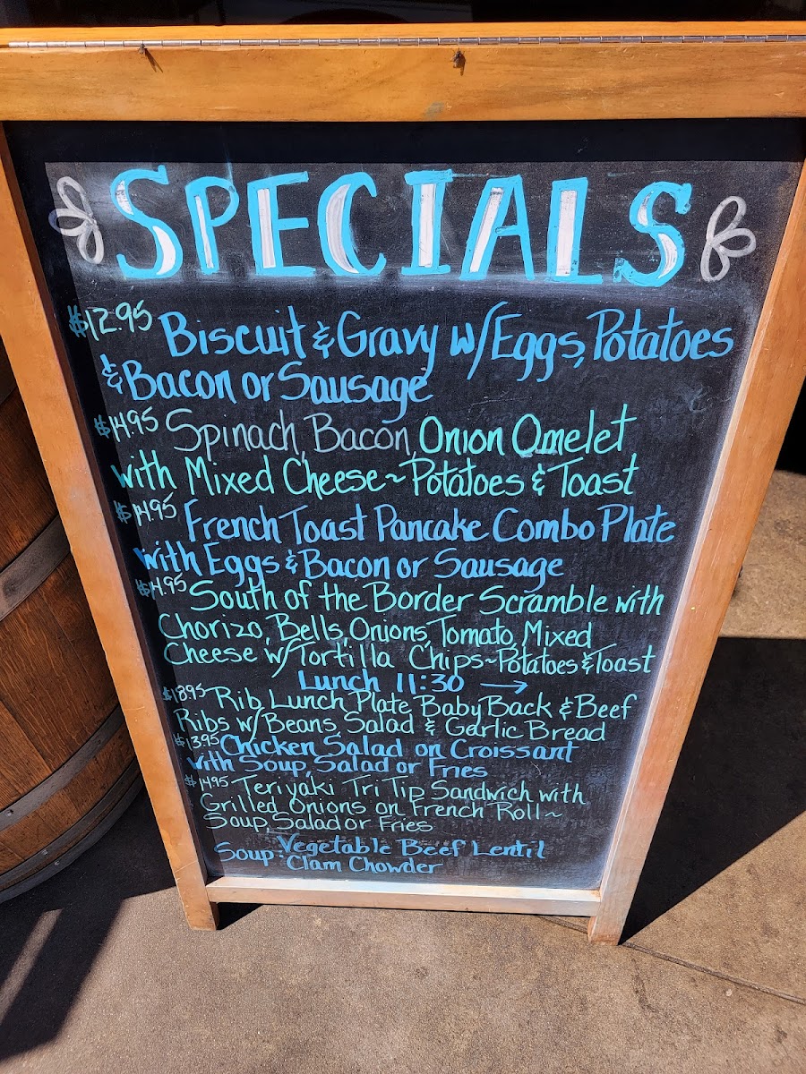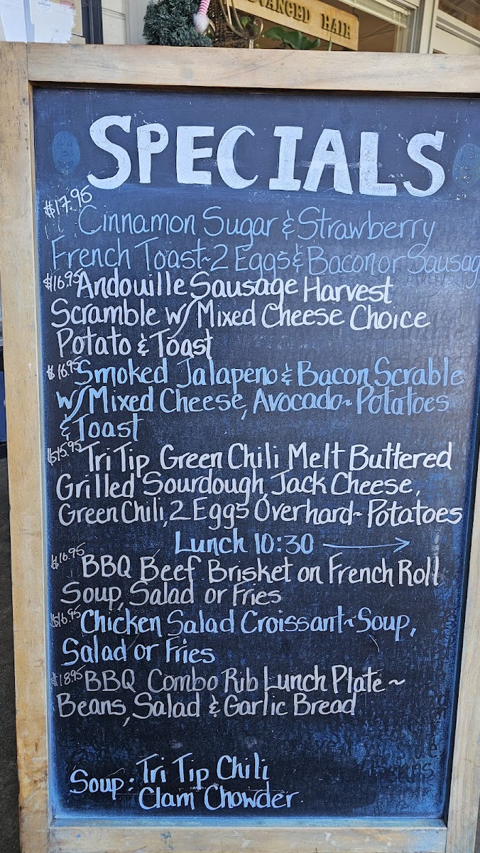 - Barbecue and Dinner Plates: This section features items such as pork ribs, tri-tip dinners, chicken fried steak with eggs, cowboy platters, and meat sampler platters.