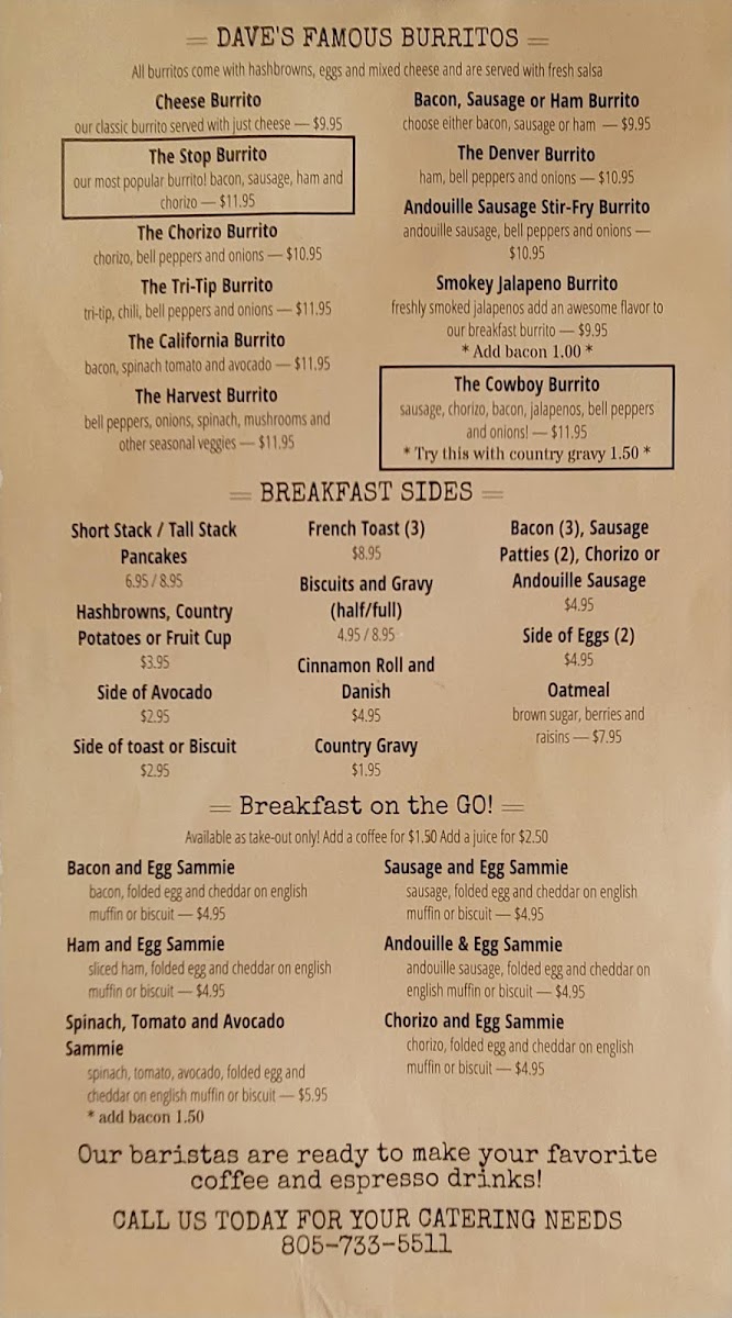 The menu caters to different meal times, offering hearty breakfasts, midday sandwiches, and more substantial dinner plates. Coffee and baked goods support coffee breaks or lighter meals throughout the day. Overall, the structure allows for both quick service and casual sit-down dining.