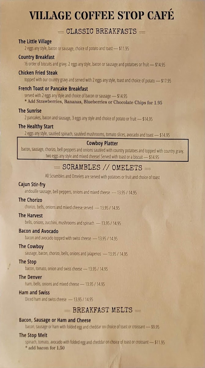 The menu at The Village Coffee Stop & Catering offers a variety of options spanning breakfast, lunch, and dinner, with selections suitable for casual dining and quick orders. It includes a range of American-style dishes, coffee beverages, and barbecue items.
